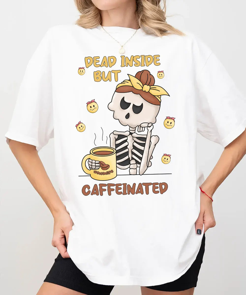 • Vintage skeleton mom design with “Dead Inside But Caffeinated” text