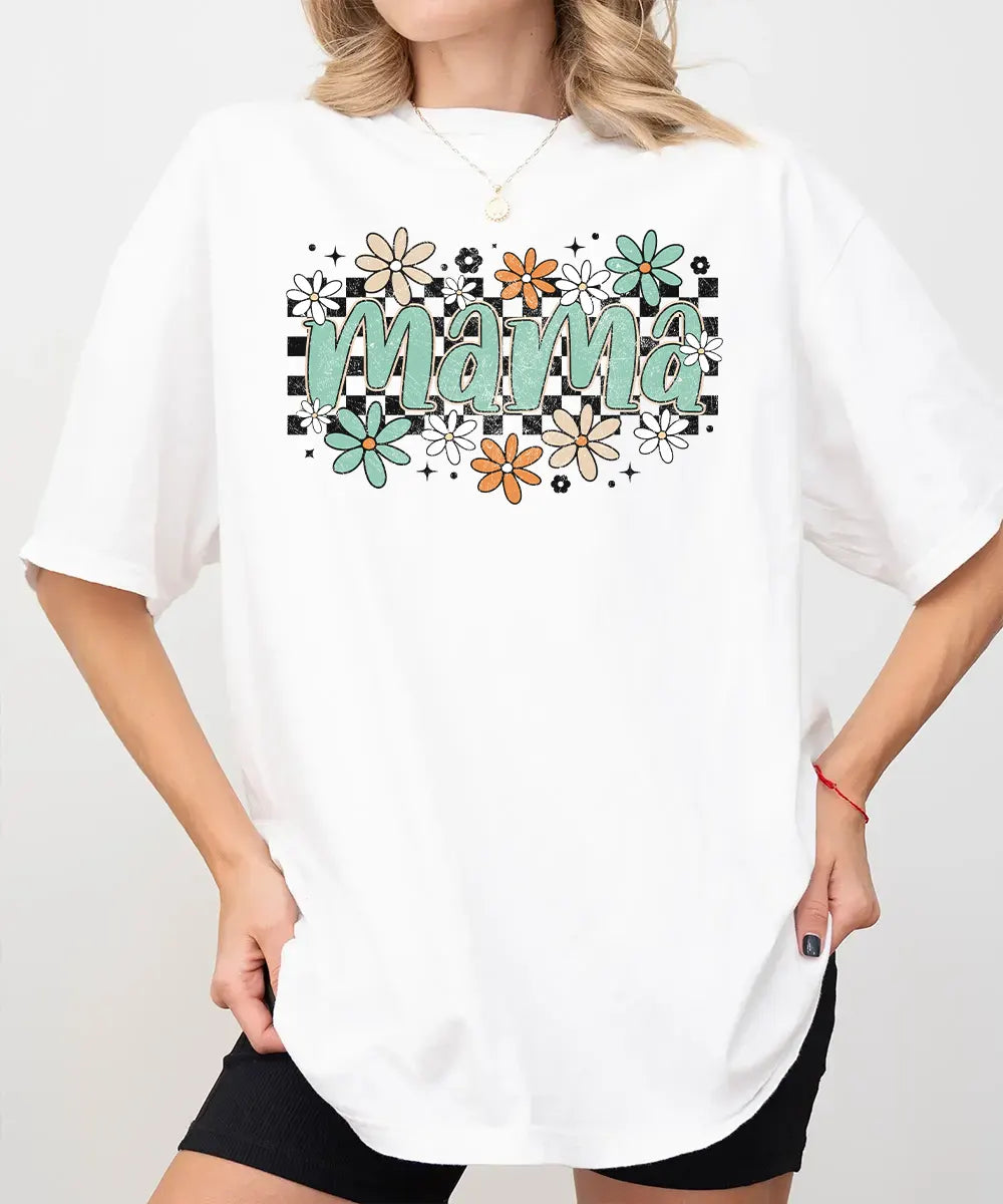 • Design: “Mama” in retro floral lettering — warm vintage tones that pop beautifully on neutral bases