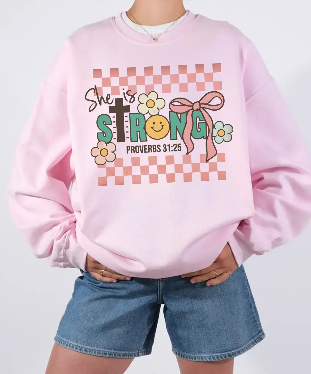 • Design: Retro “She is strong – Proverbs 31:25” text with vintage-style lettering